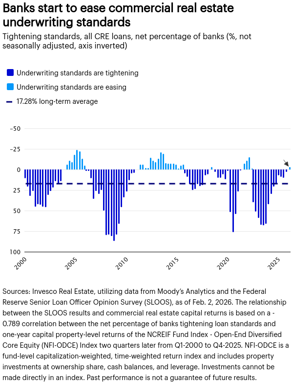 Sources: Invesco Real Estate, utilizing data from Moody’s Analytics and the Federal Reserve Senior Loan Officer Opinion Survey (SLOOS), as of Feb. 2, 2026. The relationship between the SLOOS results and commercial real estate capital returns is based on a -0.789 correlation between the net percentage of banks tightening loan standards and one-year capital property-level returns of the NCREIF Fund Index – Open-End Diversified Core Equity (NFI-ODCE) Index two quarters later from Q1-2000 to Q4-2025. NFI-ODCE is a fund-level capitalization-weighted, time-weighted return index and includes property investments at ownership share, cash balances, and leverage. Investments cannot be made directly in an index. Past performance is not a guarantee of future results. Banks start to ease commercial real estate underwriting standards are tightening.